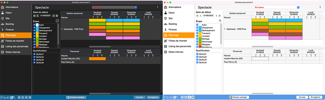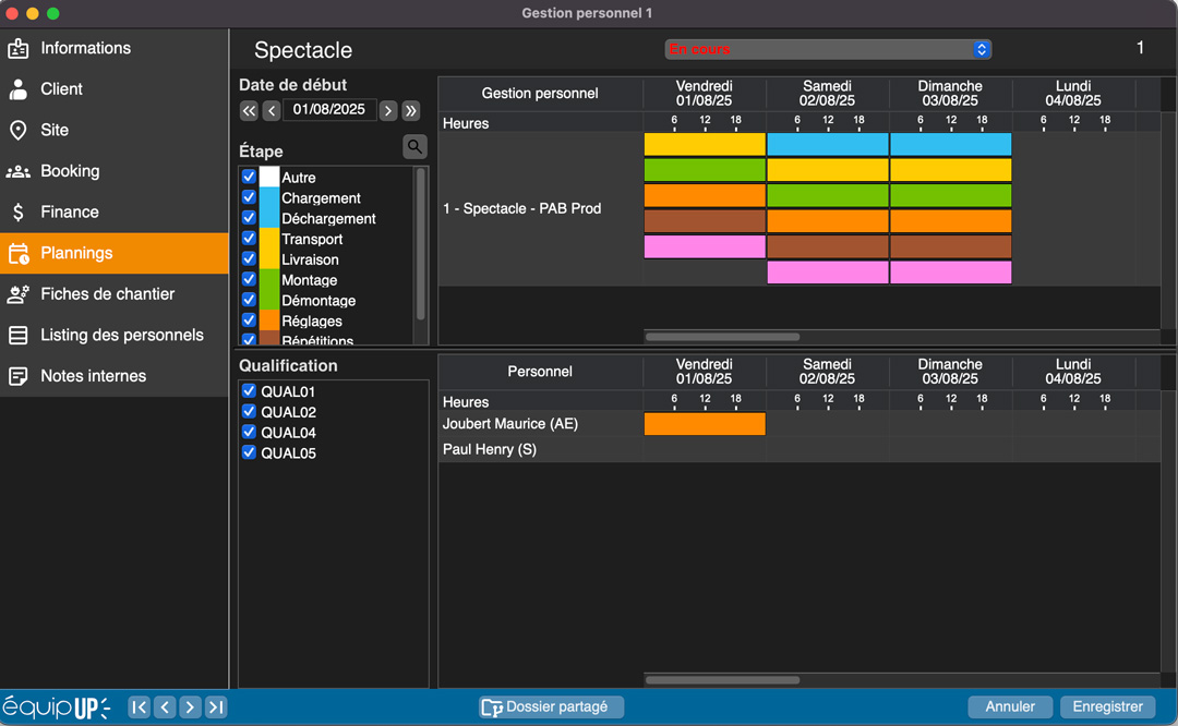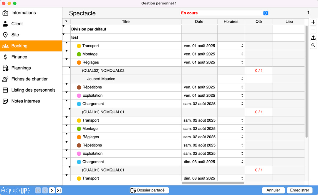 J’ai mes dates, 2 jours. Je vais pouvoir créer une “Division”, avec trois étapes pour le premier jour, par exemple livraison, montage et exploitation. Je sélectionne la première “Qualification” nécessaire en cochant Livreur, la deuxième en cochant Technicien lumière, et la troisième en cochant Pupitreur. Idem pour le deuxième jour avec d’autres étapes et éventuellement d’autres qualifications.