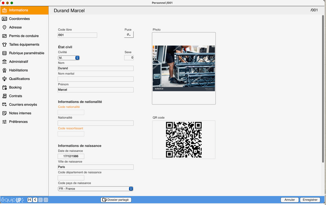 – La fiche complète de chacun des techniciens avec lesquels vous travaillez : leurs coordonnées, date de naissance, N° de Sécurité sociale, date de visite médicale, N° de passeport, statut (intermittent, entreprise ou salarié fixe), qualifications, habilitations, tarifs horaires, etc. Il y a même un champ pour leur taille de vêtements et leur pointure…