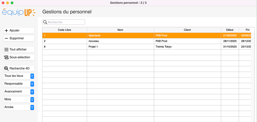 Le but d’équipUP est de gérer tous les besoins en humains d’une affaire que ce soit en prestation ou en installation, et ce, quel que soit votre logiciel de gestion de matériel. Car équipUP fait cavalier seul, mais en interactivité avec le personnel par le Web grâce à son serveur qui devient le serveur du prestataire moyennant une licence 4D Web.