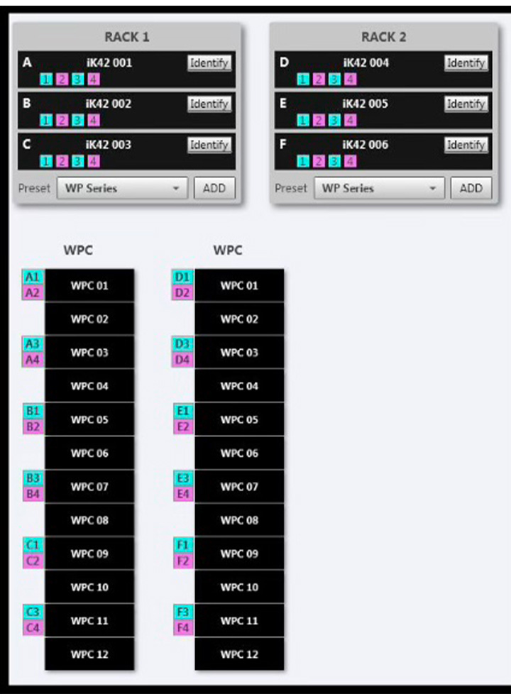 Manu Borie : Ce sont les iK 42, fabriqués par Linea Research pour Martin, 4 entrées 4 sorties avec DSP intégré. Ces amplis intègrent une très belle offre de filtrage dont les filtres propriétaires Hardman et LIR. Une fois le shoot du système approuvé dans le logiciel DISPLAY, celui-ci génère le preset correspondant à tous les traitements nécessaires pour obtenir les différentes options retenues lors de la prédiction : pression, annulation arrière, évitement, etc…