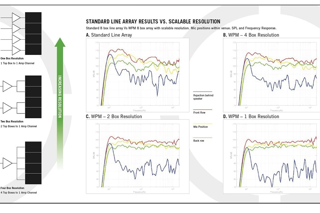 Stéphane Torlois : La WPC utilise bien entendu une technologie de guides d’onde au niveau des enceintes, mais leur couplage en ligne source est assisté par du traitement DSP qui reste totalement transparent à l’écoute. Cette particularité permet d’être extrêmement précis dans son calage. Si nous lui demandons de s’arrêter à 40 m et de chuter alors de -6 dB, cela ne pose aucun problème. De même pour gérer une diffusion asymétrique, jardin cour.