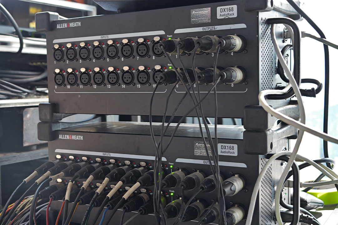 Pour permettre toute liberté de câblage et d’action dans les festivals où nous avons peu de temps pour les changement de sets, nous ne partageons pas leurs racks de scène, mais nous fournissons des splitters analogiques vers les consoles d’accueil.