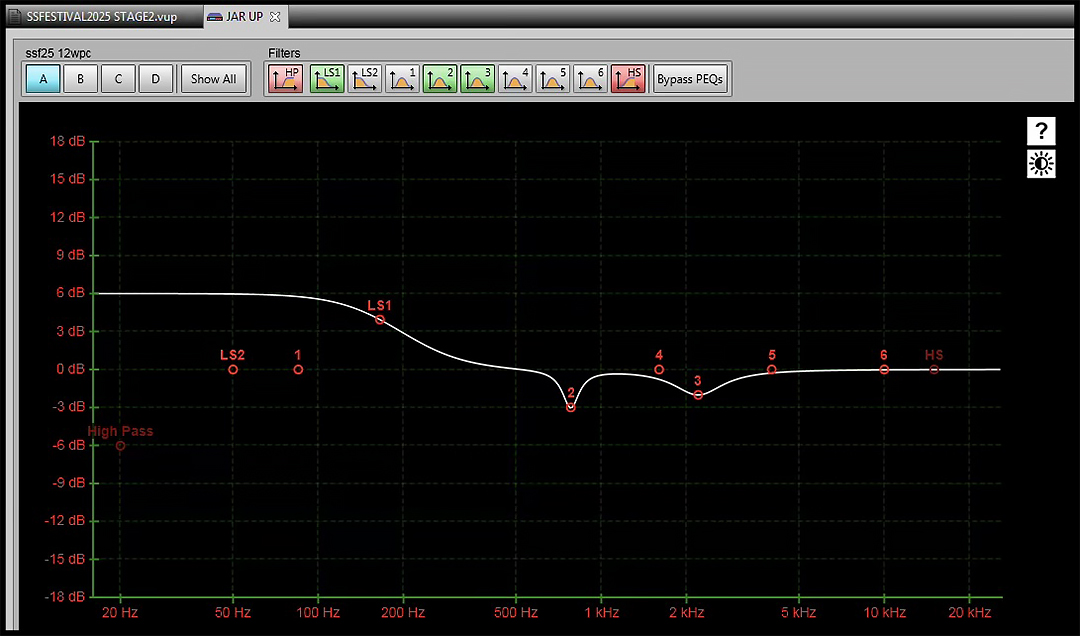 Ce preset est ensuite chargé dans les amplis par le logiciel VU-NET. La prédiction fonctionne parfaitement. A la pose du premier micro de mesure in situ, tout est pratiquement prêt. Les presets chez Martin Audio sont totalement documentés. J’aime beaucoup cette transparence qui permet de reproduire un preset si jamais tu dois travailler avec d’autres processeurs et aussi de comprendre comment le fabricant opère en inspectant le détail des traitements. Ceci me permet parfois d’agir avec efficacité sur certaines parties du traitement dans des cas particuliers.