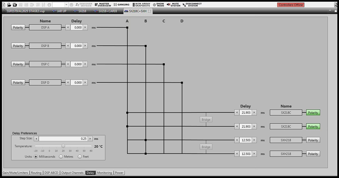 Manu Borie : Tu disposes de traitements d’égalisation sur les entrées pour faire un traitement général. Comme dans tous les autres logiciels de contrôle, tu peux aussi faire des groupes pour contrôler les différentes parties du système de diffusion, et ensuite les corriger comme tu le souhaites. Pour le SunSka, nous faisons la correction générale dans le processeur DX4, plus facile à gérer avec la diversité des setups accueillis.