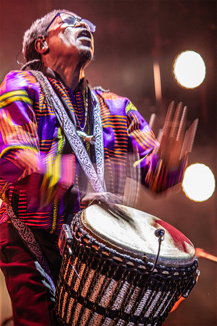 Nicolas D’Amato : Sur le djembé qui joue un rôle plutôt important pendant ce spectacle car il intervient souvent avec des solos très dynamiques, nous avons placé deux packs Spectera équipés de capsules Neumann MCM KK14 en top et bottom.
