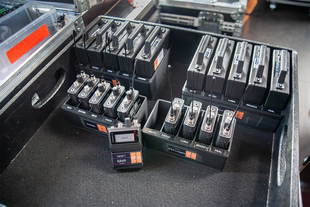 Nicolas D’Amato : Nous avons déployé deux Base Station et 42 boîtiers émetteurs-récepteurs SEK que nous appelons communément les packs. 32 d’entre eux sont utilisés pour l’ensemble des in-ear monitor des artistes, musiciens, invités et techniciens. Les autres pour des liaisons micro sans fil, dont entre autres un clavier, la grosse caisse de Matthieu et le djembé qui intègre deux liaisons top/bottom.