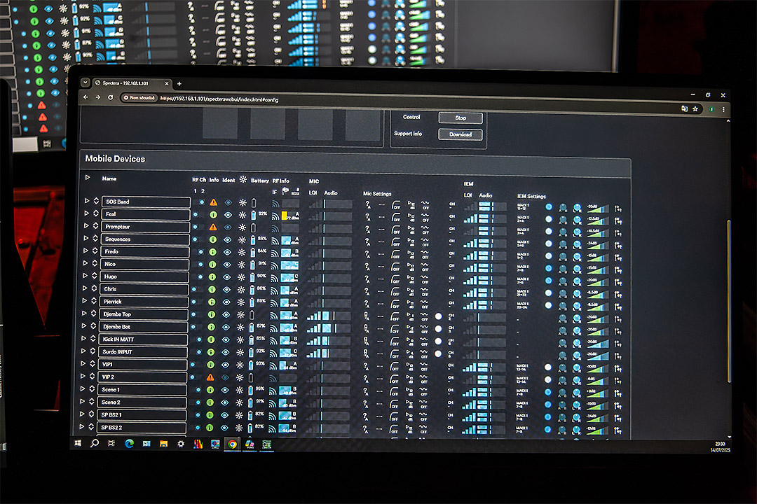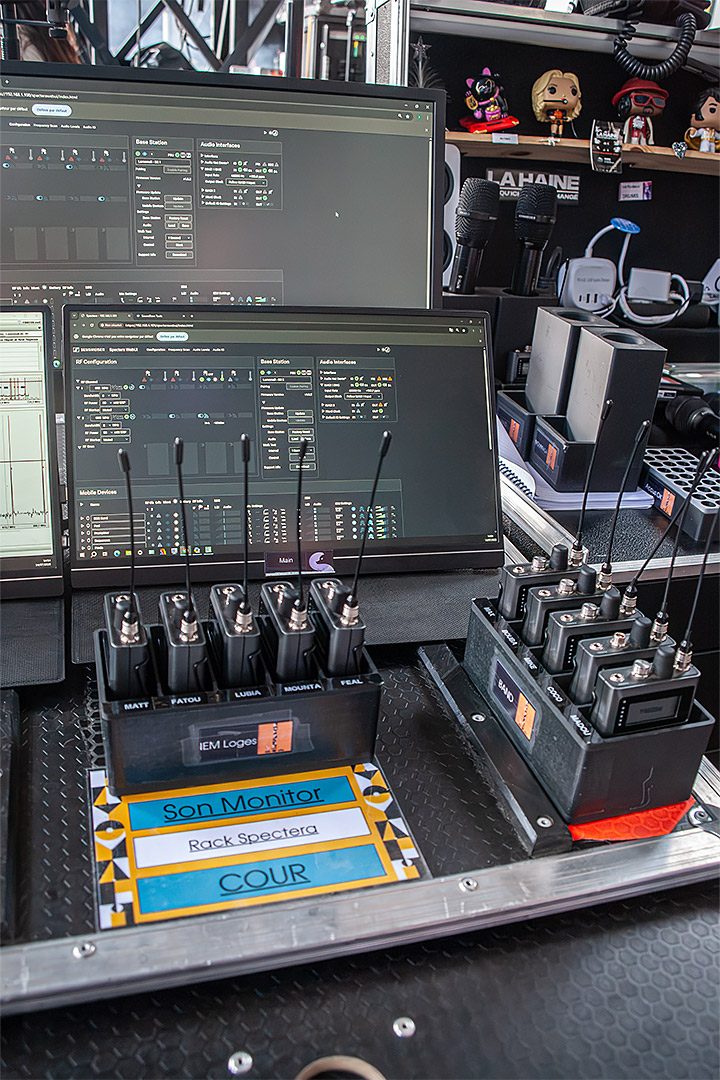 Hugo Pacé : Avant Spectera, je devais prendre tous les packs de ears et faire le tour de la scène pour vérifier que tout fonctionnait sans bruit ni altération. Avec Spectera, je gagne presque deux heures de travail, très utile dans les festivals où nous n’avons juste le temps des changements de plateau pour vérifier. Nous réécoutons évidemment tout le système par sécurité, mais les drops analogiques classiques par effet de masque et autres interférences, ont disparu du paysage.