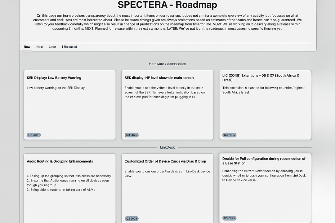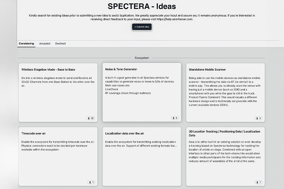 Charly Fourcade : Effectivement, le système permet des évolutions assez nombreuses. Afin de pouvoir arbitrer sur le développent de celles-ci, Sennheiser a mis en place plusieurs canaux d’échange avec les utilisateurs Spectera. Sur le site my.sennheiser.com, une interface sous forme de page web permet de suggérer, voter ou commenter de nouvelles features, mais aussi voir ce qui est déjà prévu et confirmé pour l’avenir (Spectera Roadmap). Il y a aussi un canal Discord ou une communauté échange directement avec l’équipe Sennheiser. (Plus d’info sur www.sennheiser.com/spectera-lab) On peut voir par exemple que le mode « engineer » est prévu pour janvier l’an prochain, que l’idée d’une unité pour 8 antennes additionnelles est considérée, etc…