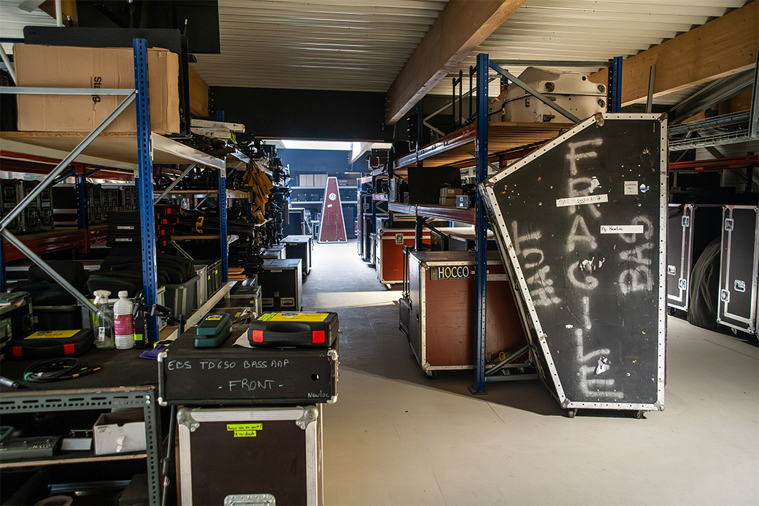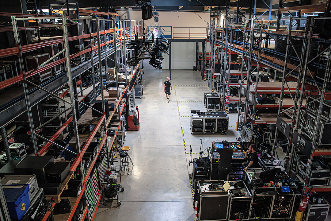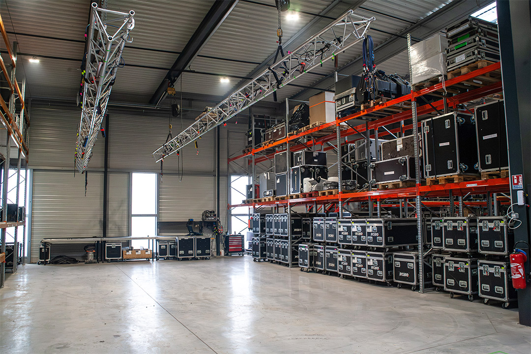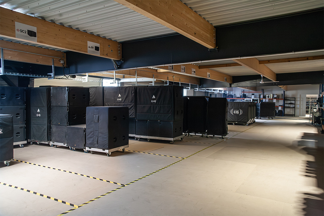 Ce nouvel entrepôt central de 4 000 m² a été divisé en trois cellules coupe-feu pour optimiser les flux : Backline et Sonorisation, Logistique, Lumière et Vidéo.