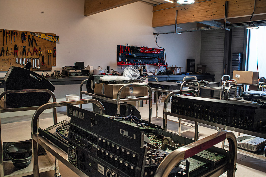 Un SAV dédié intervenant sur l’intégralité des domaines audio, vidéo, lumière et instrument veille à l’entretien et à la réparation du parc d’équipements.