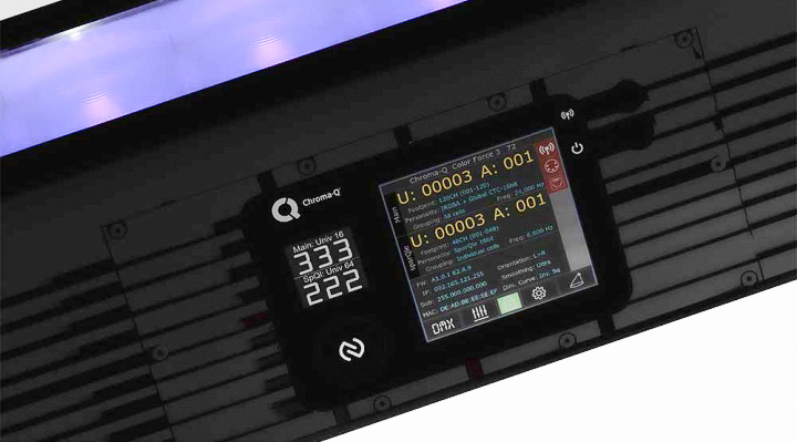 Là on se dit qu’on a déjà un aperçu bien complet du projecteur, mais le fabricant nous réserve une dernière petite surprise ! Outre l’interface de paramétrage NFC et les options de pilotage sans-fil qui complètent les possibilités de configuration, on découvre juste à côté du LCD tactile principal un second petit écran de 1 pouce monochrome qui comme on le remarque, affiche les données essentielles du Color Force : adresse DMX, ID du projecteur, mode DMX ou texte personnalisé.