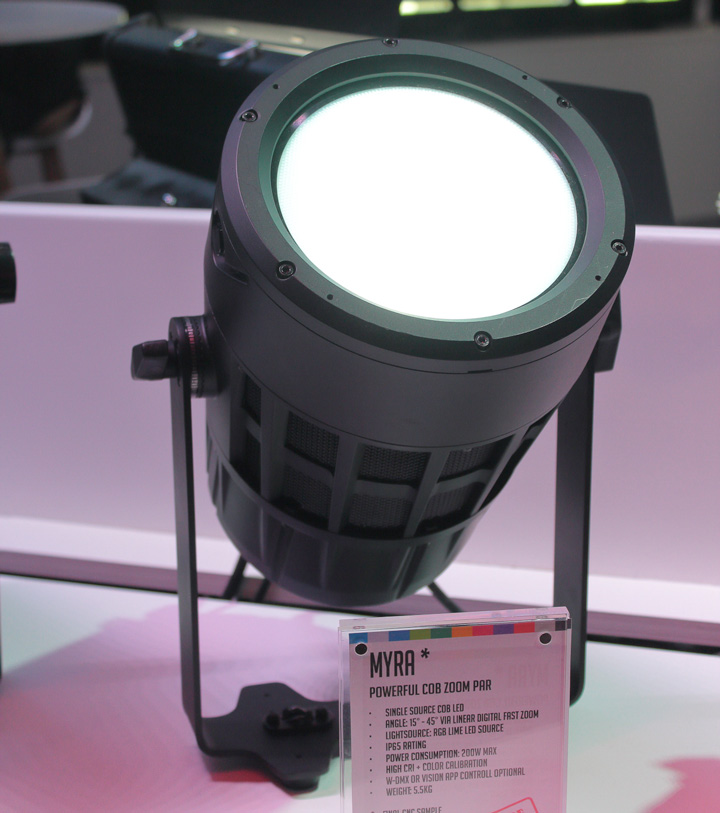 Toujours dans la catégorie des projecteurs statiques, Myra est un projecteur type PAR IP65 équipé d’un moteur de LEDs RBG+Lime de 150 W.