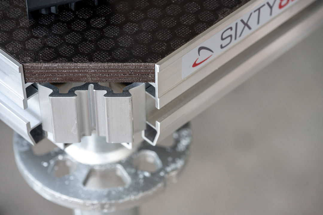 Le tout nouveau Sixty82 Scaff Deck, une avancée pour les plateformes d’échafaudage. Conçu pour répondre aux exigences du secteur de la location et de l’événementiel, ce plateau se distingue par sa robustesse accrue avec ses coins robustes et soudés, un contreplaqué épais de 15 mm contre 12 mm en général sur le marché, et ce contreplaqué collé au cadre subit moins de torsions et de flexions.