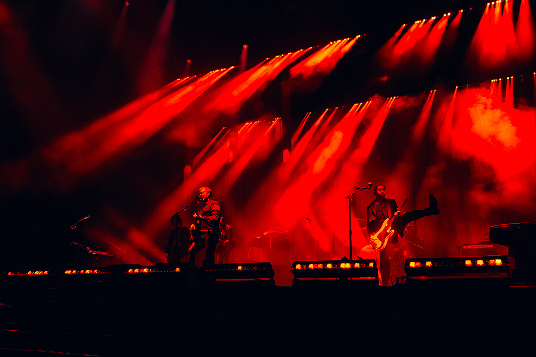 Le show vidéo et lumière est en partie synchronisé sur un timecode en Art-Net, tandis que d’autres éléments sont opérés en live. Les consoles lumières GrandMA3 Full Size communiquent directement avec Modulo Kinetic en Art-Net. Tom Kenny, lighting designer de la tournée, peut ainsi contrôler l’intensité de certains paramètres vidéo depuis sa console, assurant une cohérence totale entre lumières et images. Cette gestion centralisée en live contribue à créer un univers visuel homogène et harmonieux, à la hauteur du dernier voyage scénique d’un groupe de légende.