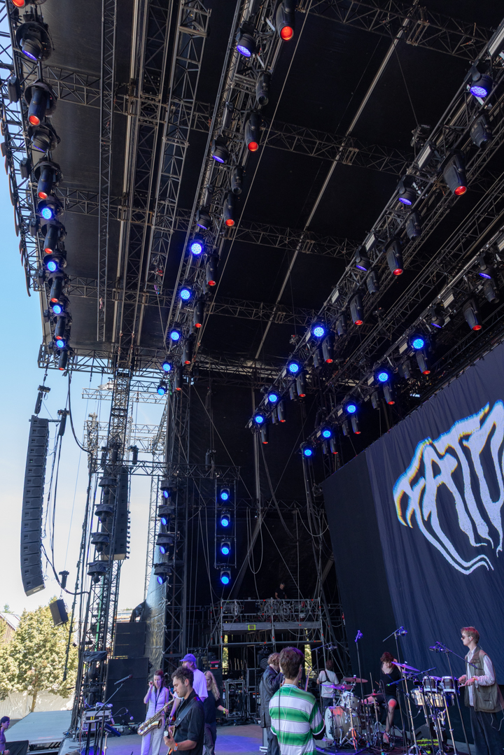 Nicolas Champion : Du fait de l’environnement, la grande scène n’est pas aussi grande que celle d’autres festivals. Avec un arbre à cours et une route à jardin, le plateau ne fait que 21 mètres d’ouverture quand on est généralement sur 25 à 26 mètres. Malgré cet espace réduit, on arrive plus ou moins à faire rentrer les shows au chausse-pied (rire).