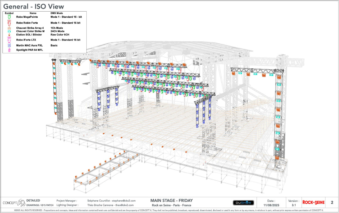 Stéphane Courtillot : Sur Rock En Seine nous avons fait la conception de toutes les scènes en lumière, avec Dushow comme prestataire technique. On bosse « mano à mano » sur l’installation, avec des équipes communes Concept K / Dushow.