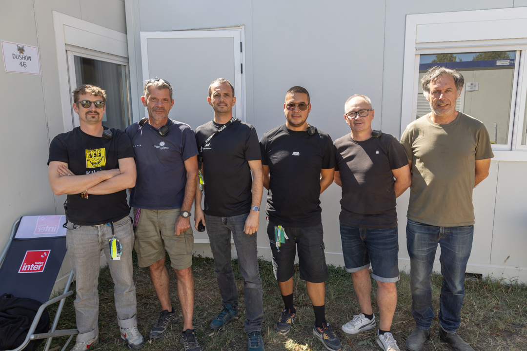 (de gauche à droite) Stéphane Courtillot pour la lumière (lumière – Concept K), Jean-Christophe Fages (Rig – Seven), Sébastien David (Potard), Régis NGuyen (lumière – Dushow), Frédéric Ciezki (Son – B-Live) et Nicolas Champion (Coordinateur technique de Rock en Seine).